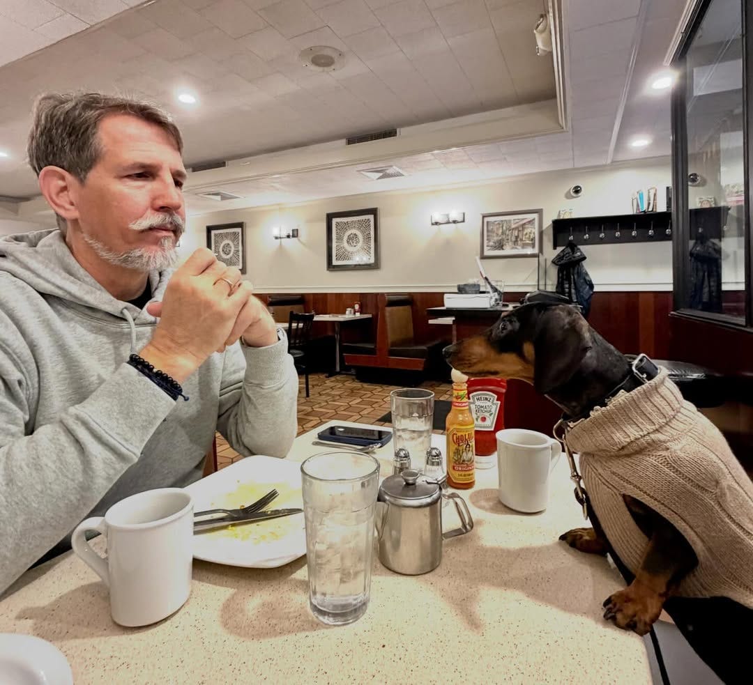Crown Prince Pavlos and Crown Princess Marie-Chantal of Greece have arrived in New York with their dog. She shared a photo of her husband on Instagram sitting in a traditional American diner with the caption: “Good morning NYC!” Style points are awarded to the dog for its beige jumper…