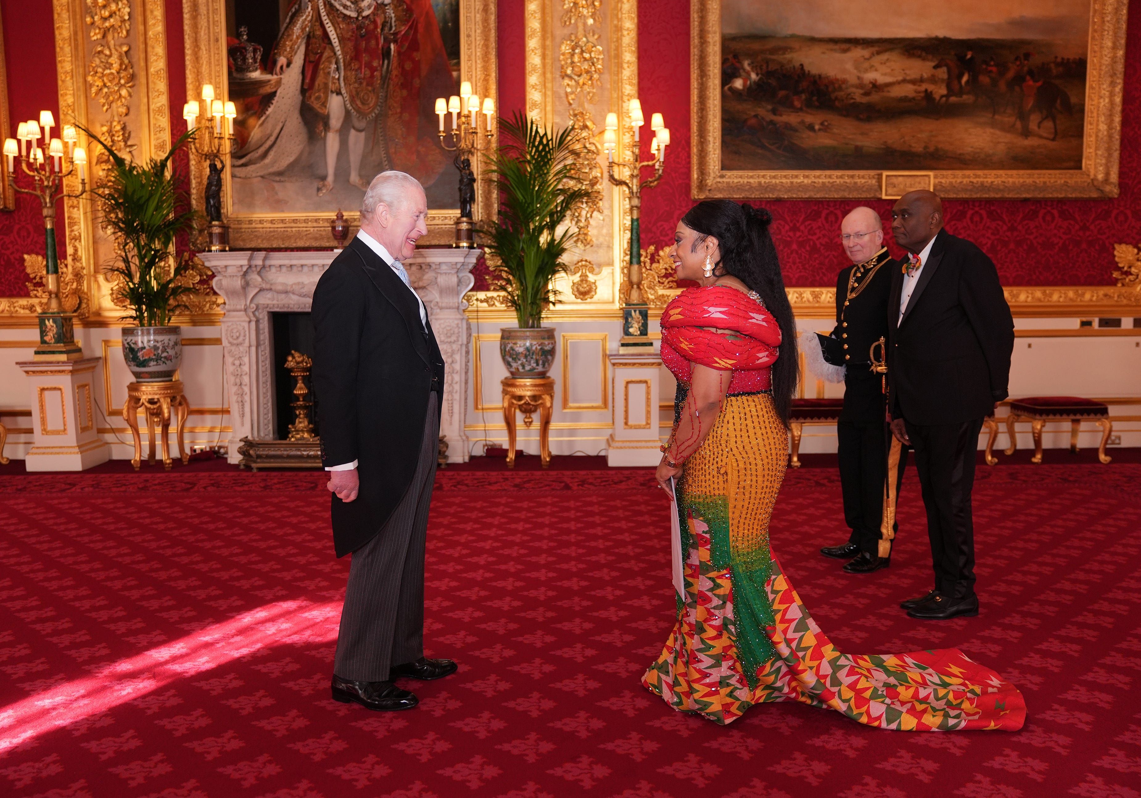 For today’s royal engagement, King Charles hosted a special audience at St James’s Palace. He is pictured with Sabah Zita Benson, High Commissioner for the Republic of Ghana, and her husband, Bobby Benson.