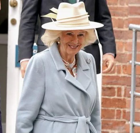As you will have read, Queen Camilla stepped out in a very summery dress today at the races. She paired the floral dress with a more autumnal, belted blue coat – no surprise, given how temperamental the weather has been this year.