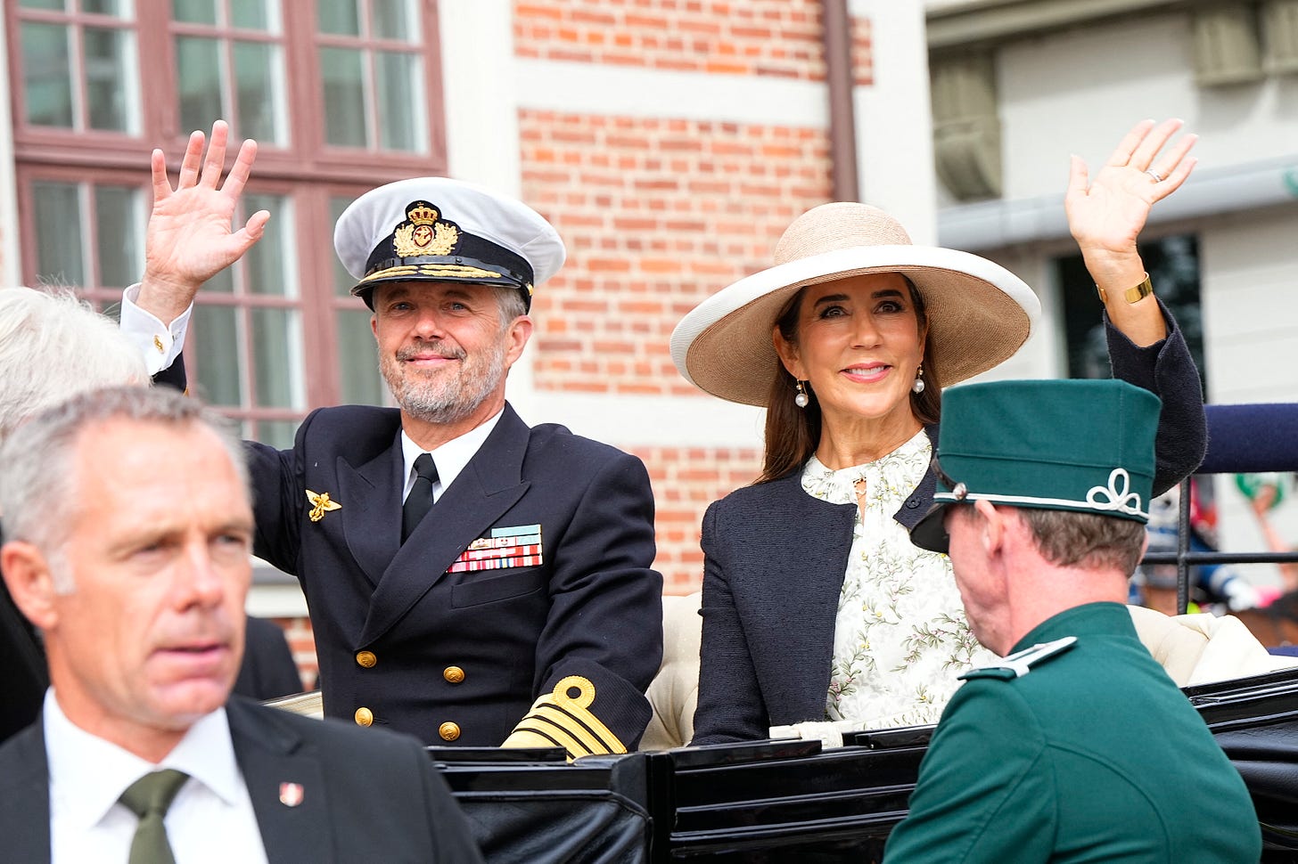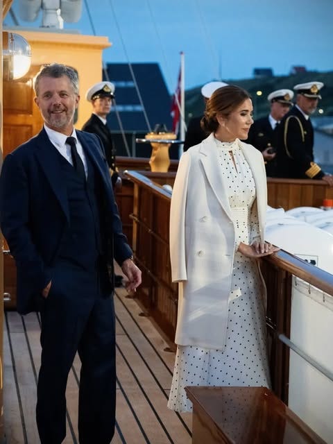 She’s currently sailing on a four-day summer cruise with King Frederik, visiting several Danish municipalities along the coast. She rewore one of her much loved ME+EM dresses to board the yacht, as pictured below.