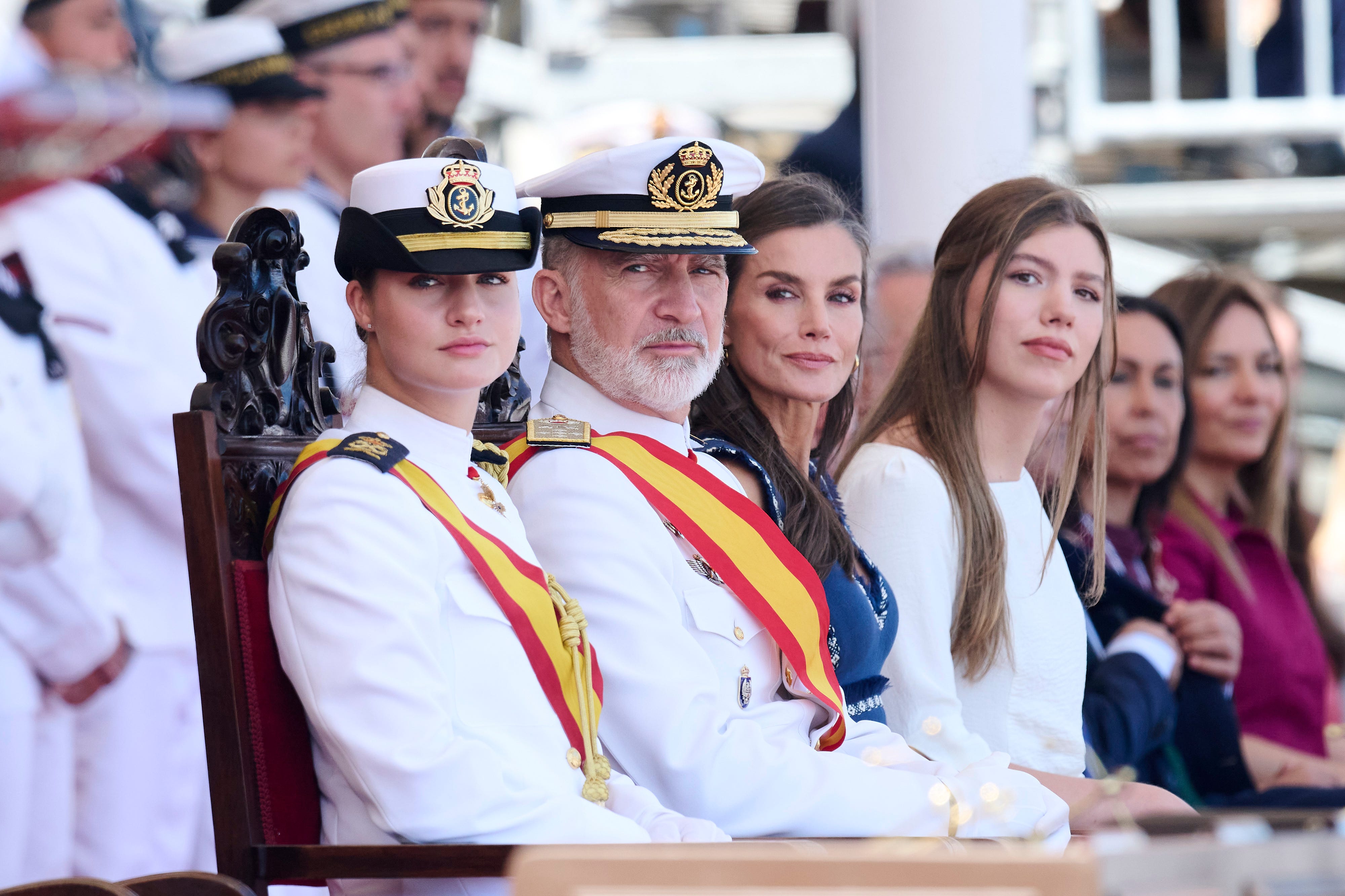 The Spanish royals made quite the picture as Princess Leonor, King Felipe, Queen Letizia and Princess Sofia attended a presentation of royal dispatches of employment at Escuela Naval. Princess Leonor has received the Grand Cross of Naval Merit with white badge, a distinction that recognises her training and commitment to the military career, in the context of the forthcoming completion of her studies at the Naval Military School. The ceremony took place during the ceremony of delivery of Royal Dispatches and appointments to the new officers of the Navy.